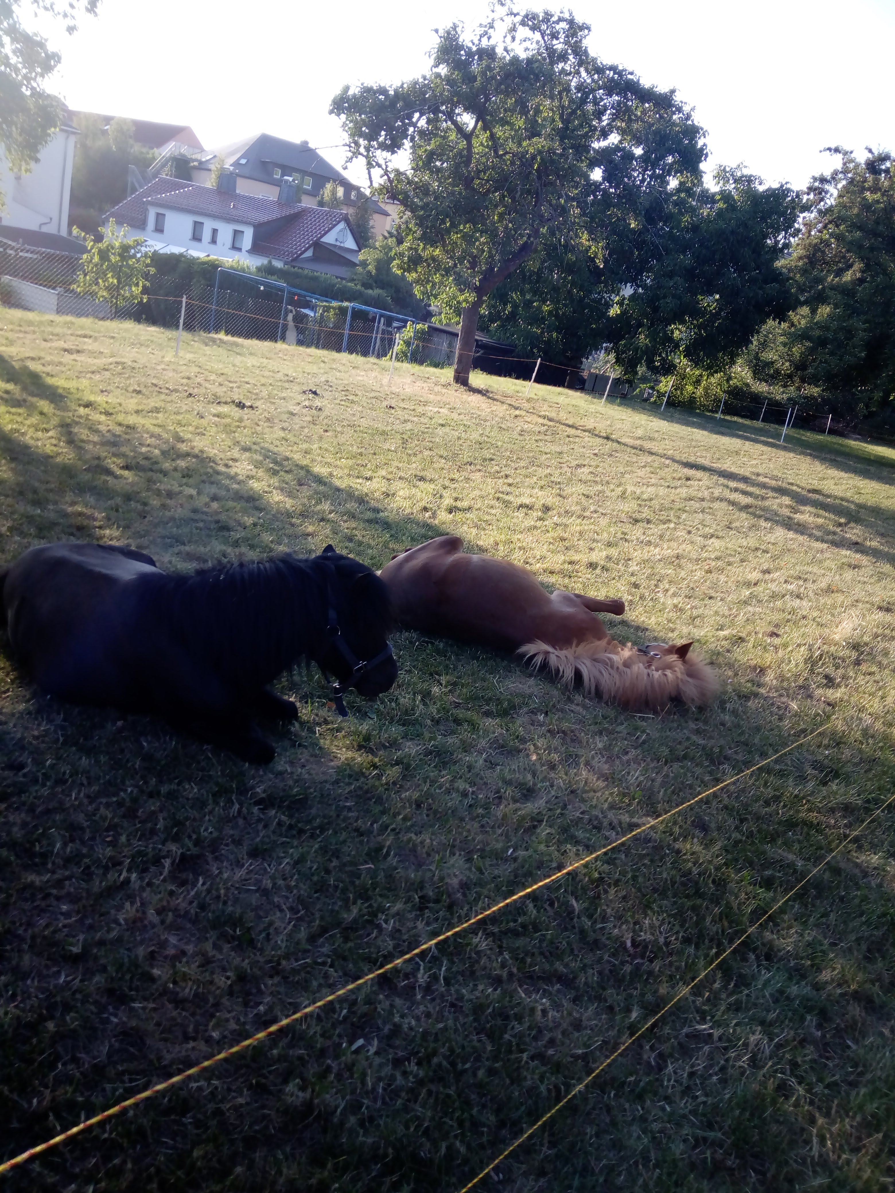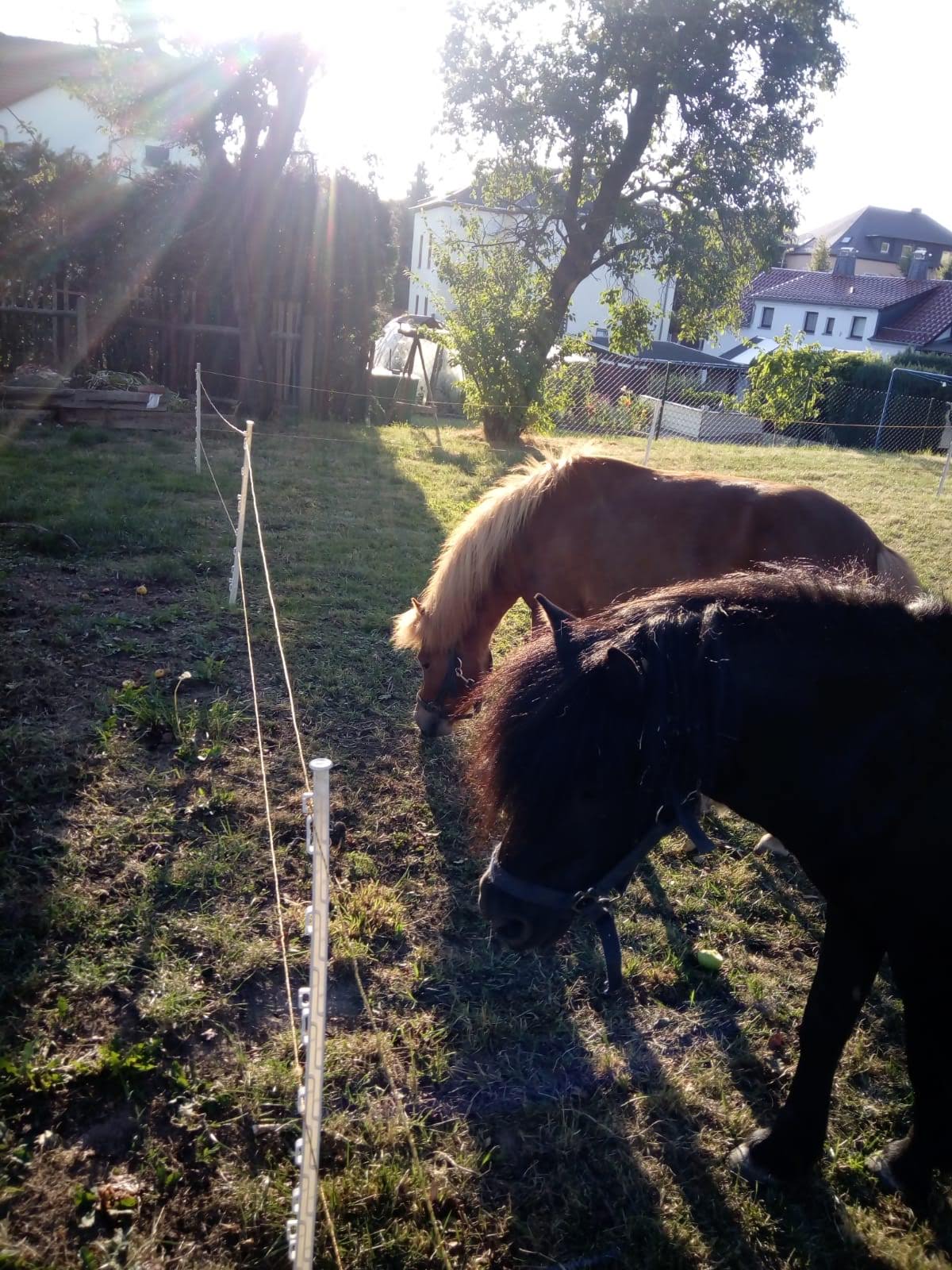 Bedingt durch die lange Dürre wurde auch bei uns im Tierpark das Futtergras knapp. An Heu (das wir zukaufen müssen) ist ebenfalls immer schwerer zu kommen. So hat es unsere Ponys Max und Ono besonders gefreut, dass unser Tierpark-Muhli den tierlieben Nachbarn Herrn Schmidt hat, der sich über die Gesellschaft und das kostenlose Rasenmähen unserer Ponys freut. Also wurde auf der Wiese ein Koppelzaun gezogen und Wasser bereitgestellt. Schon konnten die Ponys heute dem Muhli hinterher auf die leckere Wiese laufen.