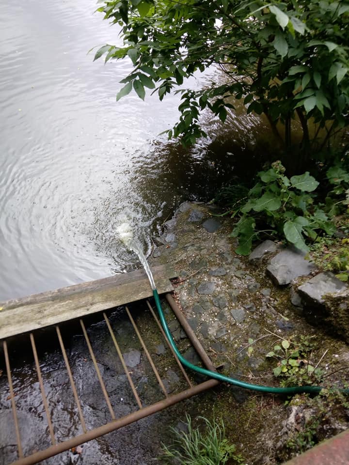 Da uns das Veterinäramt dieses Jahr schon zweimal auf den schlechten Zustand des Teichwassers ansprach, nutzen wir gleich die Gelegenheit, sauerstoffreiches Wasser in den (der Stadt gehörenden) Teich zu leiten. Wir hoffen, die Fische freut es.